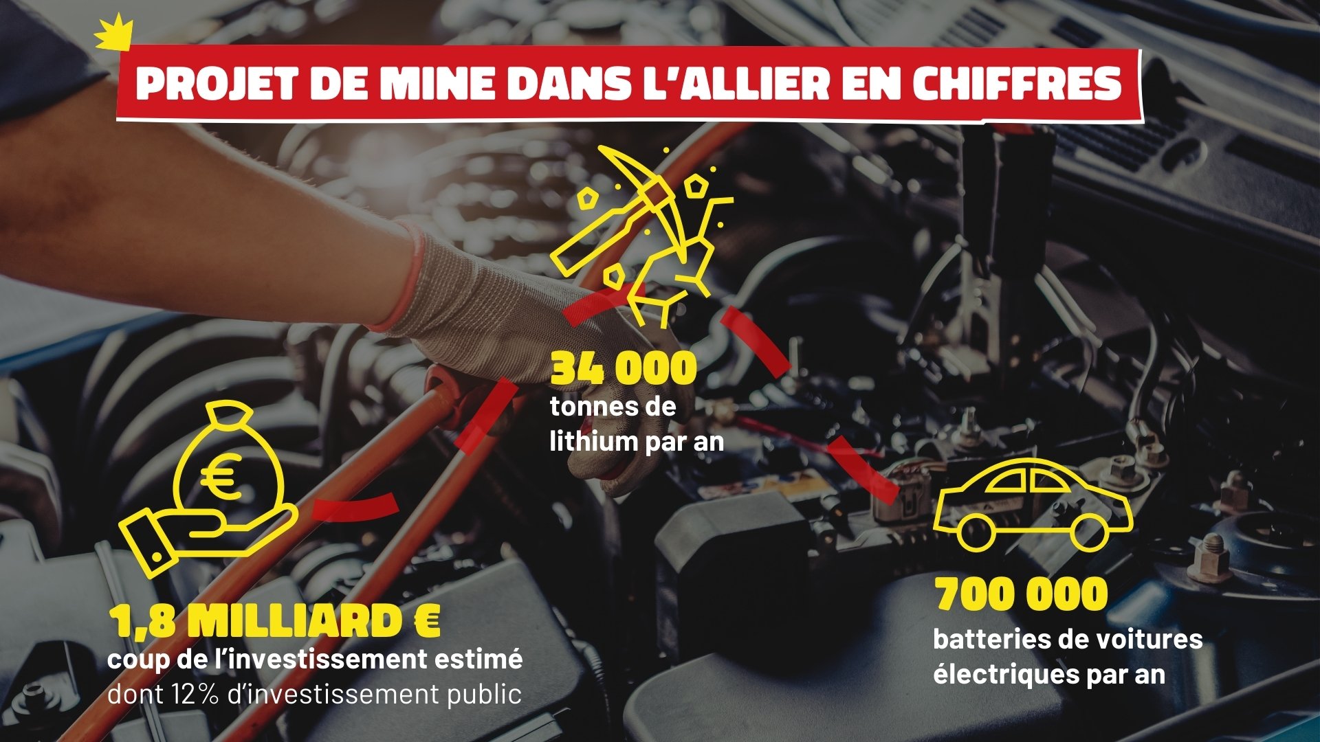 Dans le département de l’Allier, l’entreprise Imerys souhaite implanter une mine et des installations industrielles pour exploiter un important gisement de lithium à partir de 2028. L’industriel annonce sa volonté d’extraire 34 000 tonnes de lithium chaque année pendant 50 ans, ce qui permettrait de produire l’équivalent de 700 000 batteries de voitures électriques tous les ans.